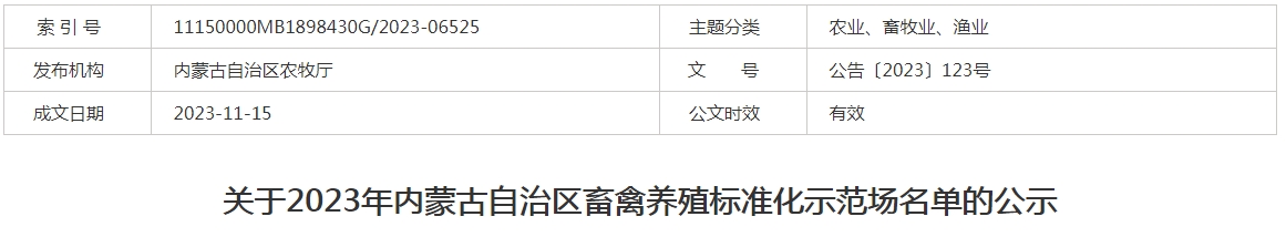 標(biāo)題:關(guān)于2023年內(nèi)蒙古自治區(qū)畜禽養(yǎng)殖標(biāo)準(zhǔn)化示范場名單的公示