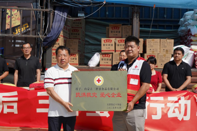 風雨突襲巴彥淖爾時,內蒙古農牧業(yè)產業(yè)化龍頭企業(yè)協(xié)會會長單位巴彥淖爾市三胖蛋食品有限公司與家鄉(xiāng)共赴暖陽8月1日,三胖蛋公司開展“一戶不落”精準捐贈活動,為套海鎮(zhèn)和平村436戶受災村民送去價值15萬元的米、面、油等生活物資。這個從河套平原走向全國的品牌,用行動詮釋著”家鄉(xiāng)人永遠和家鄉(xiāng)人站在一起“的質樸承諾。