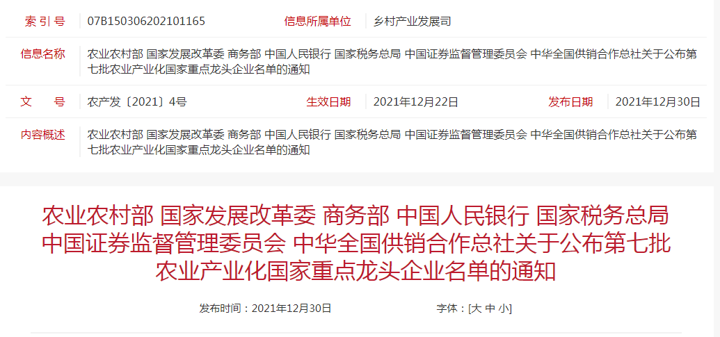 企業(yè)名稱:農業(yè)農村部 國家發(fā)展改革委 商務部 中國人民銀行 國家稅務總局 中國證券監(jiān)督管理委員會 中華全國供銷合作總社關于公布第七批農業(yè)產業(yè)化國家重點龍頭企業(yè)名單的通知